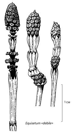 Форма аберрантных побегов у трех видов современного хвоща. У Equisetum «debile» это - фертильные зоны, такие же как у ископаемого эквизетиностахиса [10, с изменениями]. Вершина стробила у E.telmateia остается активной, и по существу он представляет собой фертильную зону, расположенную на междоузлии [11, с изменениями]. Стробилы E.hyemale располагаются на вершинах осевого и боковых побегов, чем напоминают растения двух мезозойских родов Equisetites и Neocalamites.