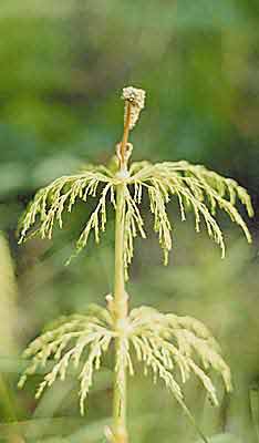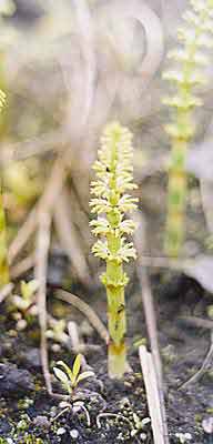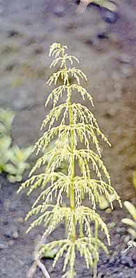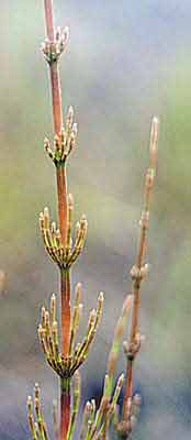 Ранней весной даже горожанин, наверное, замечал на обрывах канав, что проложены вдоль дорог, красновато-белые столбики, устремленные вверх. Это генеративные побеги хвоща полевого (Equisetum arvense). На конце побега находится стробил (с лат. - шишка) - орган размножения, в котором образуются споры. После их созревания надземная часть отмирает и появляется невысокое, 15-30-сантиметровое растение, похожее на маленькую елочку. Его ажурные боковые ветви, собранные мутовками, отходят от узлов рифленого полого стебля. Листья у хвощей превратились в мелкие чешуйки, прижатые к узлам и не способные к фотосинтезу; эту функцию выполняют зеленые стебли и ветви. Другие виды этих многолетних трав с жесткими, пропитанными кремнеземом стеблями, могут достигать метровой высоты, а у некоторых полегающих видов стебель иногда тянется на 9 м.