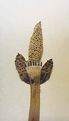 Летом 1998 г. в приустьевой части Монастырского оврага (Ульяновская обл., правый берег Волги в 10 км выше по течению от г.Тетюши, близ с. Монастырское) мне попались на глаза несколько экземпляров современного хвоща зимующего (Equisetum hyemale), побеги которого существенно отличались от нормальных: стробилы располагались не только на главном осевом побеге, но и на двух-трех коротких боковых ветвях, идущих от самого верхнего узла. Ниже у всех экземпляров боковые ветви на стебле отсутствовали, что весьма характерно для этого вида хвощей. Стробил на основном побеге, как правило, был значительно лучше развит, чем на боковых ветвях. Высота собранных растений колебалась от 50 до 80 см при ширине стеблей 4 мм, а длина междоузлий варьировала от 38 до 65 мм.