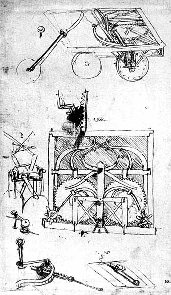 Известно, что у Леонардо встречаются вольные пересказы тех или иных авторов. Так, по разным источникам мы знаем, что он был знаком с учением Парижской школы XIV в. о природе движения и теории рычага. Однако Леонардо не добавил ничего существенного: высказывания его здесь нечетки и непоследовательны. Но, может быть, он был первым, кто заинтересовался движением по наклонной плоскости.