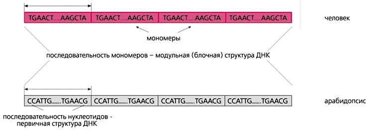 Рис. 3. Структура ДНК в центромерах человека и растения.