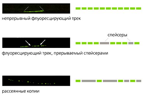 и треки с разрывами (спейсерами) различных размеров (в середине и внизу).Теломерные повторы могут располагаться вдоль плеч в интерстициальных и даже в прицентромерных районах хромосом, но сами по себе не образуют функциональную теломеру. Вполне логично думать, что для ее формирования необходимы специализированные белки, обволакивающие теломерную ДНК и защищающие концы хромосомы от нежелательных воздействий. Теломерную ДНК можно рассматривать как платформу для сборки больших комплексов белков, ключевой среди которых - комплекс теломеразы. Кроме того, в реализации ее функций участвуют другие системы: ДНК-белковый комплекс, формирующийся на одноцепочечном G-выступе, и белковые комплексы на двухцепочечной ДНК теломерного повтора. Некоторые белки специфически локализованы на теломерах, но основная их часть присутствует и в других участках хромосом.