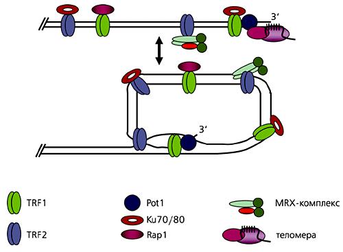Предложена модель белкового комплекса из шести теломер-специфических белков, формирующегося на теломерах хромосом человека [7]. ДНК образует t-петлю, а одноцепочечный выступ внедряется в двухцепочечный участок ДНК, расположенный дистально (рис.6). Белковый комплекс позволяет клеткам отличать теломеры от мест разрыва хромосом (ДНК). Не все белки теломер входят в состав комплекса, который избыточен на теломерах, но отсутствует в других районах хромосом. Защитные свойства комплекса вытекают из его способности воздействовать на структуру теломерной ДНК по крайней мере тремя способами: определять структуру самого кончика теломеры; участвовать в образовании t-петли; контролировать синтез теломерной ДНК теломеразой. Родственные комплексы найдены и на теломерах некоторых других видов эукариот.