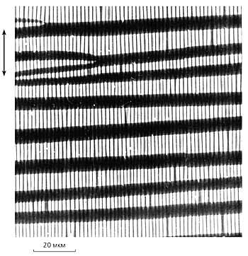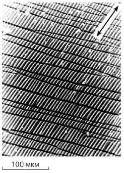 Если такую пленку с покрытием подвергнуть простому растяжению в одном направлении *, на ее поверхности произойдут удивительные превращения. На рис.1 представлена электронная микрофотография рельефа полимерной пленки с покрытием после растяжения пленки в полтора раза. Светлые полосы являются фрагментами разрушившегося покрытия, а темные - образовавшиеся трещины, т.е. обнажившаяся поверхность полимера. Видно, что покрытие распадается на множество сильно вытянутых островков-полос примерно одинакового размера, ориентированных перпендикулярно направлению растяжения, и одновременно на этих фрагментах возникает регулярный волнообразный рельеф.