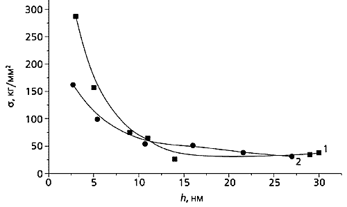(Пленку с покрытием растягивали на 100% при 90°С.)Теперь можно попытаться использовать формулу (1) для оценки прочности твердого тела в слоях нанометрового диапазона. На рис.3 представлены зависимости прочности платины и золота, вычисленные с помощью соотношения (1), от толщины металлического слоя, нанесенного на полиэтилентерефталатную пленку. Видно, что в интервале толщин от 30 до ~15 нм прочность обоих металлов практически не зависит от толщины и составляет 18-22 кг/мм2 для золота и 25-30 кг/мм2 для платины. Эти значения количественно согласуются с известными значениями прочности для блочных металлов (17.6-25 кг/мм2 для золота и 24-35.1 кг/мм2 для платины [10]). В то же время при уменьшении толщины покрытия ниже примерно 15 нм прочность обоих металлов начинает возрастать: для платины достигается значение 150-170 кг/мм2, для золота - до 280 кг/мм2. Получается, что прочность металла в нанослоях по крайней мере на порядок превосходит прочность блочного материала. Приведенные результаты можно считать первой прямой экспериментальной оценкой прочности твердого тела нанометрового размера в условиях его растяжения. Кроме того, эти данные позволяют провести условную границу между размерами твердого тела, в данном случае металла, в обычном объемном состоянии и в наносостоянии. Итак, ответ получен, прочность твердого тела зависит от его размеров в наноразмерном диапазоне: чем меньше размер, тем выше прочность. Важно отметить, что, несмотря на отсутствие прямых измерений прочности твердого тела в нанослоях, теория предсказывает рост прочности твердых тел при переходе к наномасштабам [11]. А что происходит, наоборот, в макромире?