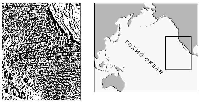 карта рельефа дна Тихого океана в районе Восточно-Тихоокеанского поднятия (б) и положение участка в Тихом океане (в).Сопоставим два рельефа - рельеф полимерных пленок с тонким покрытием, растянутых в одном направлении, и реально существующий рельеф океанического дна. Это позволяет сделать рис.4, где представлены электронная микрофотография поверхности растянутой каучуковой пленки с золотым покрытием и карта рельефа участка океанического дна в районе Восточно-Тихоокеанского поднятия [13]. Рельеф типа показанного на рис.4,б занимает колоссальные пространства на дне, измеряемые многими тысячами километров (не менее трети площади всего Мирового океана). Замечательно, что рельеф океанического дна поразительно напоминает рельеф, получаемый при растяжении полимерных пленок с твердым покрытием [14]. Такое внешнее сходство подтверждает сделанные выше предположения об общности механизма явлений, происходящих в системах “твердое покрытие на податливом основании” самого различного масштаба. Отметим, что происхождение системы регулярно расположенных на дне трещин (трансформных разломов), параллельных друг другу, не имеет сегодня своего объяснения.