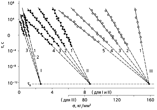 Рис. 7. Зависимость долговечности от напряжения при разных температурах [16].
