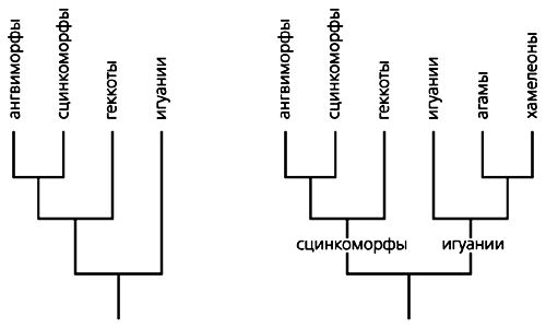 Варианты родственных связей основных подгрупп ящериц. Слева - вариант, предложенный Р.Эстесом и др. [4], справа - автором [14].