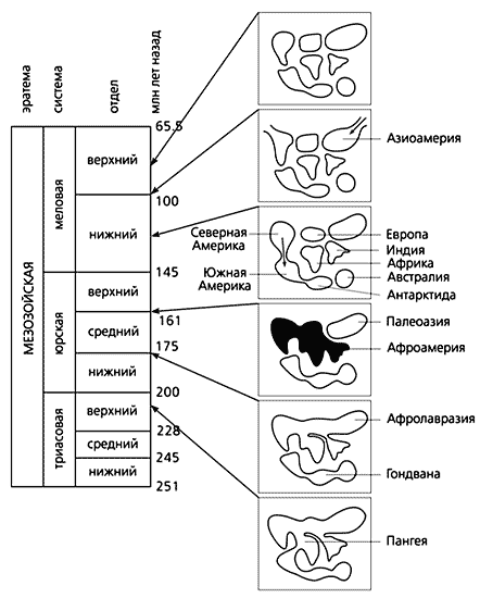 Реконструкция последовательности континентальных связей в мезозое по фаунистическим данным [11, 12].