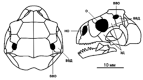 Черным цветом показаны носовые отверстия (но), орбиты (о) и верхние височные окна (вво).Говоря о меловых ящерицах древней Азии, нельзя обойти вниманием синеоамфисбену (Sineoamphisbaena), описанную в литературе по находкам в верхнемеловых отложениях Внутренней Монголии (Китай) [15]. Широкая костная межглазничная перегородка, крупная мозговая капсула, раздвоенный затылочный мыщелок и укороченная нижняя челюсть и ряд других признаков сближают эту ископаемую форму с амфисбенами, или двуходками. Современные амфисбены ведут скрытный образ жизни - обитают в норах, которые роют головой. Видимо, с этим связаны такие преобразования, как утрата конечностей, редукция некоторых костей крыши черепа. Однако в отличие от раннекайнозойских и современных амфисбен, у синеоамфисбены были хорошо развиты передние конечности (задние не обнаружены), а элементы верхних височных дуг напоминали эти же детали строения у ящериц, хотя и имели некоторые ограничивающие амфикинетизм особенности. И то, и другое свидетельствует об архаичности ископаемой формы, еще не достигшей совершенства в роющей специализации. Похоже, что в образе синеоамфисбены проявляются черты несомненного родства амфисбен и ящериц. Но включать первых в состав вторых нет необходимости.