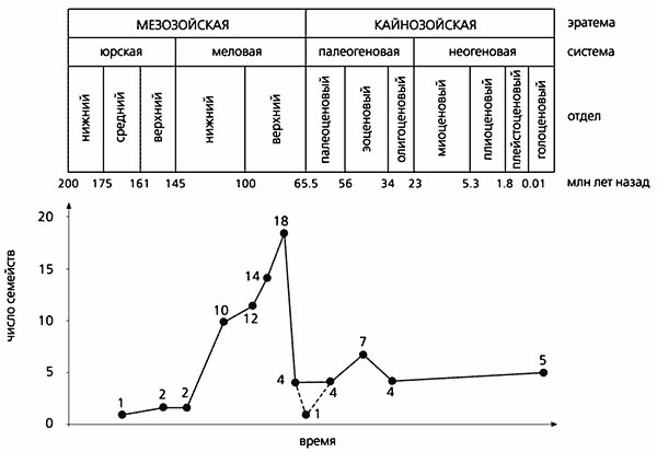 В кайнозое наибольшее и наименьшее число семейств совпадают с периодами самых высоких и самых низких палеотемператур.