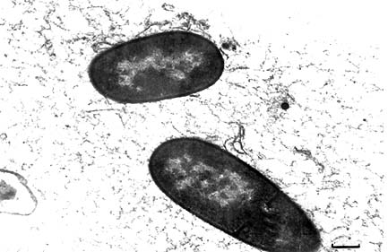Одиночные вегетативные клетки сибиреязвенной бактерии. Каждая клетка заключена в плотную оболочку, называемую клеточной стенкой, под которой находится цитоплазматическая мембрана. Большую часть объема клетки занимает бактериальный аналог ядра эвкариотических организмов — нуклеоид, содержащий генетический материал.