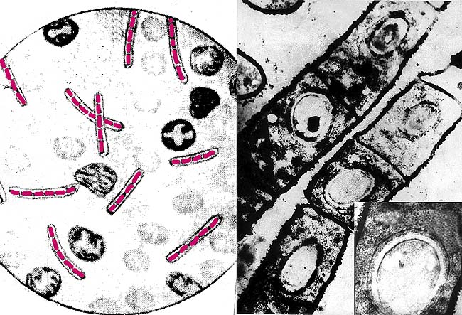 Цепочки вегетативных клеток. Такие колонии хорошо заметны в поле зрения светового микроскопа (слева).На микроэлектронной фотографии (справа) видны споры, созревающие внутри каждой бактериальной клетки.
