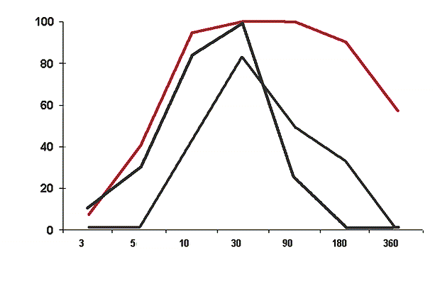 Сроки возникновения и сохранения иммунитета, развивающегося у лабораторных животных при введении сибиреязвенных вакцин. Защитный эффект рассчитан как относительное количество выживших животных, которых после иммунизации заражали 100 дозами ЛД50 возбудителя.Верхняя кривая - сухая комбинированная вакцина, средняя - живая, нижняя "острая" - химическая.