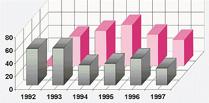 Заболеваемость людей сибирской язвой в России в 1992—1997 гг. и количество доз (х100 тыс.) вакцины, произведенной в эти же годы (цветные столбики). Прототипы вакцин будущего