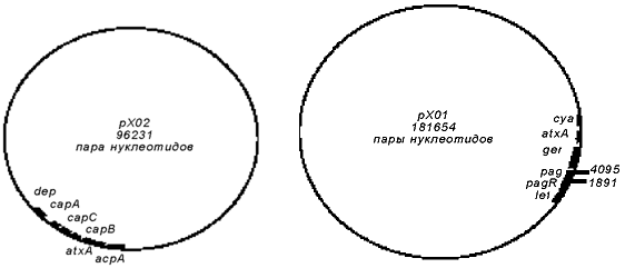 Гены первой плазмиды в основном ответственны за синтез субъединиц экзотоксина: отечного фактора (ген cya), протективного антигена (pag) и летального фактора (lef). Во второй плазмиде содержится целый кластер генов (capA, capC и capB), обеспечивающих образование капсулы, т.е. полимеризацию D-глутаминовой кислоты. Из других плазмидных генов на схеме показано положение только тех, которые управляют синтезом. В pXO1 — это положительный регулятор синтеза экзотоксина (atxA), отрицательный регулятор синтеза протективного антигена (pagR) и группа генов, обеспечивающих прорастание спор (ger); в pXO2 — положительный регулятор синтеза D-глутаминовой кислоты (acpA) и дублированный (atxA), а также ген, ограничивающий полимеризацию капсульной субстанции (dep). На схеме соблюдена размерная пропорция генов и их расположение в кольцевой структуре каждой плазмиды.Генетический аппарат сибиреязвенного микроба состоит из хромосомы и двух плазмид (pXO1 и рХО2), очень важных для вирулентности и иммуногенности внехромосомных элементов, открытых в начале 80-х годов. Плазмида рХО1 содержит три токсиновых гена — pag, lef и cya. Первый из них кодирует синтез протективного антигена, второй — летального фактора, третий — отечного фактора. Имеются также гены регуляторов синтеза этих продуктов. В плазмиде рХО2 наиболее значимы гены, определяющие синтез капсулы. К настоящему времени полностью расшифрована нуклеотидная последовательность первой плазмиды и значительная часть второй. Благодаря этому существенно расширились возможности генетических манипуляций с бациллой.