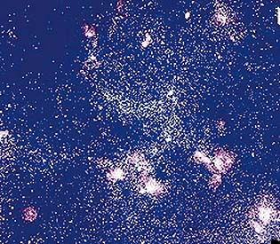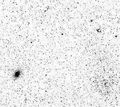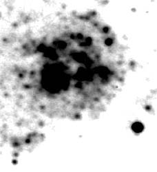 Рис. 7. Деталь предыдущего изображения - комплекс молодых скоплений в NGC 6946 (полоса I). Видны несколько арок скоплений и гигантское шаровое скопление (слева от центра). Яркий объект справа внизу считается звездой переднего фона нашей Галактики, но может оказаться и компактным скоплением в NGC 6946. Размер изображения 29’’х33’’. Как и в случае арок в БМО, можно предположить, что прародители этих арок ушли из него и дали сверхмощные взрывы. Но как быть с возрастами? Может быть неподалеку будет найдено более подходящее скопление? Для наблюдения этого уникального скопления скоплений нам предоставлено время для работы с Космическим телескопом им.Хаббла. По заявке нашего коллектива 16 июля 2000 г. инструмент будет наведен на это скопление скоплений и многие вопросы будут решены.