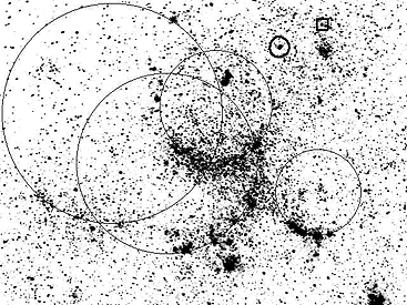 содержащий объект SGR 0526-66 (справа вверху).Эти соображения пришли мне в голову в июне 1998 г., когда я обдумывал доклад на симпозиуме по Магеллановым Облакам, который состоялся в июле в Канаде. На симпозиуме прозвучало сообщение Ф. Хаберла о распределении обнаруженных им рентгеновских двойных в БМО. На его “прозрачке” была видна концентрация этих звезд в северо-восточной части галактики. На мой вопрос, не область ли это LMC4, выступавший докладчик ответил утвердительно. Его, правда, поправили, что, мол, к северу от этой сверхоболочки. Но NGC 1978 находится как раз к северо-западу от LMC4! Я сказал, что так и должно быть, и через день объяснил в своем докладе, почему. Если звездные дуги связаны с гамма-вспышками, предки которых вылетели из NGC 1978, вблизи этого скопления естественно ожидать и повышенной концентрации родственных им объектов, вроде SGR и рентгеновских двойных.