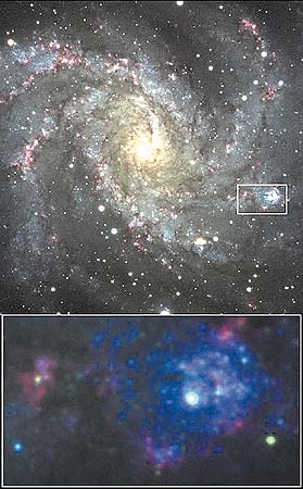 Весьма массивное скопление было недавно найдено и близ второй известной системы кратных арок, в спиральной галактике NGC 6946 (рис. 6). Эту вторую систему также обнаружил Ходж при поисках объектов, подобных кратным аркам в БМО. Не зная о его работе, С. Ларсен и Т. Рихтлер [12] заново открыли эту систему в 1999 г., описав ее как сферическое скопление звездных скоплений. Внутри него они нашли молодое шаровое скопление, самое яркое из всех молодых скоплений в изученных ими 21 галактике. Масса его может составлять миллион масс Солнца.