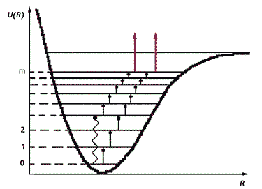 Потенциальная энеpгия U двухатомной молекулы как функция межатомного pасстояния R. Сплошные стpелки соответствуют пеpеходам между колебательными уровнями в результате столкновений, волнистая стpелка - переходам при оптической накачке. Две верхние цветные стрелки отвечают процессу диссоциации молекулы.Мы обнаружили, что в зависимости от мощности накачки энергии в колебательные степени свободы молекул возможны разные режимы нагрева. При малой мощности накачки система начинает медленно нагреваться. Нагрев остается пока незначительным, поскольку тепло успевает отводиться за счет теплообмена с окружающей средой. С увеличением закачиваемой энергии температура, характеризующая колебательные степени свободы, начинает отрываться от температуры газа.