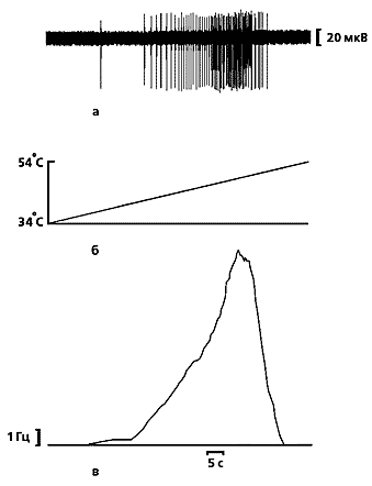 Типичная запись разрядов кожного ноцицептора (а) кошки при линейно-нарастающем нагреве (б), полученная в наших опытах [15]. Кривая (в) показывает среднюю частоту разрядов и отражает характерные особенности ноцицептивных сигналов индивидуальных С-ноцицепторов, которые представляют собой ограниченную последовательность из нескольких десятков нервных импульсов, следующих с частотой, не превышающей 20 Гц. Изобретение осциллографа совершило революцию в нейрофизиологии. В 1921 г. с его помощью американские исследователи, физиолог Г.Гассер и физик Г.Ньюкомер, впервые “увидели” нервные импульсы [7]. Оказалось, что нерв состоит из волокон, значительно (более чем в 100 раз) отличающихся по скорости проведения нервных импульсов. Наибольшую скорость проведения имели толстые миелиновые Аb-нервные волокна диаметром до 20 мкм, а самую малую — тонкие миелиновые Аd-волокна и безмиелиновые (безмякотные) С-волокна диаметром около 1 мкм. Применение осциллографа позволило зарегистрировать суммарные сигналы отдельных групп нервных волокон и выявить роль этих групп в передаче ноцицептивных сообщений.