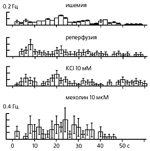 Усредненные гистограммы ответов кожных С-ноцицепторов, вызванных неноцицептивными стимулами: остановкой кровотока в подкожной артерии (ишемия), возобновлением кровотока (реперфузия), а также внутриартериальным введением калия (в малой концентрации) и мехолина. В 1969 г. американские физиологи П.Бессу и Э.Перл зарегистрировали сигналы таких индивидуальных кожных С-афферентов кошки, чувствительные окончания которых возбуждались различными, но исключительно ноцицептивными (механическими, термическими и химическими) стимулами [14]. Полимодальность этих сенсоров и их избирательная чувствительность к ноцицептивным стимулам идеально соответствовали предполагаемым свойствам ноцицепторов. Открытие ноцицепторов подвело итог длительному этапу в развитии ноциологии, и теория специфичности одержала убедительную победу.