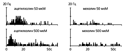 Ответы кожных С-ноцицепторов, вызванные болевым (в данном случае: “болевыми” концентрациями ацетилхолина, слева) и неболевым (мехолином даже при увеличении его концентрации до 500 мкМ) химическими стимулами. Ноцицептивные стимулы всегда вызывают высокочастотные разряды (выше 2 Гц). Таким образом, стала понятна природа ноцицептивного сигнала: им оказалось высокочастотное возбуждение (вплоть до 20 Гц) ноцицепторов. Примерная частотная граница, отделяющая ноцицептивные разряды от субноцицептивных, составляет 2 Гц.