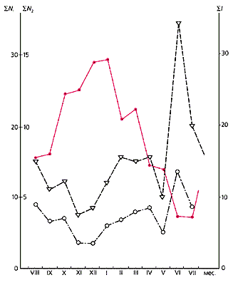Рис. 4. Средняя интенсивность штормовых микросейсм (SI) и количество землетрясений (SN) малых энергий (9 Ј K Ј 11), по данным за 1968—1982 гг. — SN1 для глубины h Ј 20 км; — SN2 для 20 < h Ј 30 км. SI — показано цветной линией.Байкал, находящийся в сейсмически активной зоне, может служить идеальной естественной моделью для выявления действия штормовых вибраций на возникновение землетрясений. Озеро, расположенное в центре азиатского континента, казалось бы, не должно подвергаться действию разрушительных ветров, подобных действующим в океанских циклонах и тайфунах. Однако и здесь возникают условия, когда скорость ветра достигает 30—50 м/с. Представим себе, что спокойный атлантический циклон, потеряв свою мощность при движении по лесам континента, перемещается с запада на восток (подобные циклоны нам демонстрируют каждый день по телевидению на картах гидрометеослужбы), на своем пути он встречает препятствия, которые нельзя обойти. Например, циклон спускается вдоль Главного Кавказского хребта и выходит на Каспийское море. Здесь в нем проявляются свирепые свойства тайфуна. Ветер со скоростью более 30 м/с валит с ног людей, срывает с домов крыши и, наконец, падает своей тыловой частью на Каспийское море [8], образуя стоячие волны и микросейсмы.Подобная картина наблюдается и на Байкале, окаймленном горными хребтами со снеговыми вершинами. Следуя своим путем, атлантический циклон встречает на своем пути препятствие из горных возвышенностей и, пересекая их, обрушивается своими воздушными массами на Байкал. Циклон, падая своей тыловой частью на акваторию, встречает волны зыби. Здесь начинают возникать и развиваться стоячие водяные волны, создаются вибрации дна — микросейсмы. Их записывает сеть сейсмических станций, окружающая озеро (рис.5). Однако в тихие зимние месяцы вся поверхность озера покрыта метровым льдом, и штормовые микросейсмы не могут возникнуть (SI = 0). Контрастную картину представляет собой осеннее время, когда на озере развиваются мощные штормовые процессы и проявляются максимальные вибрации. С гор падают ветры со скоростями свыше 35 м/с. При пересечении циклонами акватории Байкала происходит взаимодействие многометровых волн зыби со встречным горным ветром. Создаются условия возникновения стоячих водяных волн и микросейсм земной коры. В периоды “тишины” количество землетрясений (8 Ј K < 14 и 2.3 Ј М < 5.6), проявлявшихся в каждый месяц (среднее арифметическое за девять лет), в 2.5 раза больше, чем в штормовую погоду. Коэффициент корреляции между SN и SI равен 0.77.