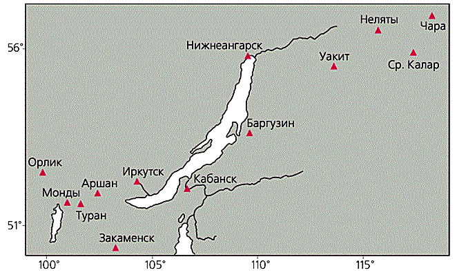 Рис.5. Места расположения сейсмических станций на оз.Байкал.Мы показали, что вибрации, действующие на дно озера, сокращают количество землетрясений с гипоцентрами, лежащими непосредственно под акваторией. Будет ли подобный вибратор уменьшать сейсмичность на некотором расстоянии от центра приложения вертикальных сил, вызванных стоячими водяными волнами? Наши наблюдения в береговой зоне Байкала [9] на различных расстояниях от естественного виратора (байкальских волн) мы ограничили коридорами, окаймляющими озеро по периметру 0—10 км (I), 10—20 км (II) и 20—50 км (III). Сравнение количества землетрясений проводилось между тихим зимним временем и бурными осенними штормовыми месяцами. Обозначим через n отношение числа землетрясений во время “тишины” (SNт) к числу землетрясений, произошедших во время штормов (SNш):