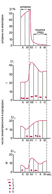 Получается, что для землeтрясений с 6 по 9 класс для I, II и III коридоров n = 1.8, 1.3, 2.7 соответственно, а для 9 и 10 класса — 4, 3 и 2. В береговой зоне в тихое время сейсмичность увеличивается в среднем в 2.4 раза по сравнению со штормовым периодом (рис.6).