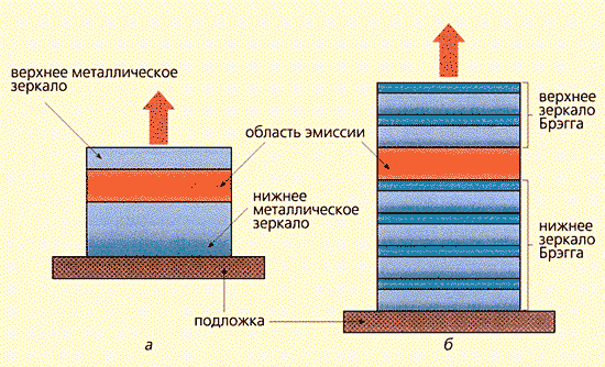 В простейших плоских оптических микрорезонаторах распространение фотона вдоль оси z ограничено металлическими зеркалами (рис.4,а) или так называемыми брэгговскими зеркалами (рис.4,б). Последние представляют собой системы чередующихся тонких диэлектрических слоев, сконструированных таким образом, чтобы за счет интерференции последовательно падающих и отраженных лучей полностью погасить прохождение света через зеркала. В качестве основного и вспомогательных слоев используют, например, полупроводники Ga1-xAlxAs с разным значением x; технология нанесения и согласования их между собой в последнее время хорошо отработана. Существуют 1D-микрорезонаторы — пленки, в которых есть одно запрещенное направление для распространения фотона, 2D-микрорезонаторы — оптические волокна, в которых запрещено свободное распространение фотонов в двух направлениях, и 3D-микрорезонаторы, в которых фотон полностью пленен (рис.1,б). В последнем случае уровни энергии фотона становятся дискретными.