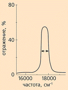 Рис. 8. Частотная зависимость коэффициента отражения от фотонного кристалла [4]. В понятии о запрещенной зоне фотонного кристалла — центральном в данном рассуждении — есть некоторая тонкость. Как уже упоминалось, различают три вида фотонных кристаллов — 1D-, 2D- и 3D-кристаллы. Полная запрещенная зона для фотонов существует только в трехмерных фотонных кристаллах. Слово “полная” означает, что запрещенная зона реализуется для произвольных ориентаций волновых векторов, т.е. для фотонов, распространяющихся в произвольном направлении (рис.9,а). В двухмерных и одномерных фотонных кристаллах запрещенная зона существует только для фотонов, которые распространяются в некотором телесном угле, достаточно широком в первых и значительно меньшем во вторых (рис.9,б). Несмотря на “неполноценный” характер таких зон, они тоже интересны для приложений, поскольку обладают многими характерными особенностями полной запрещенной зоны.