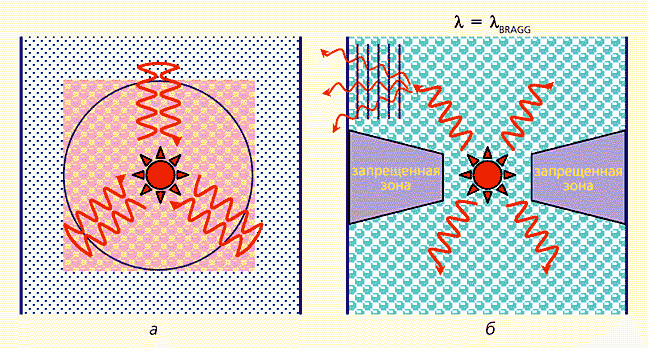 Если энергия фотона находится в разрешенной зоне, фотон свободно распространяется вдоль цепочки микрорезонаторов, хотя закон дисперсии, связывающий частоту и длину волны фотона, вообще говоря, кардинально отличается от такового для свободного фотона. Совсем необычно для оптики появление запрещенной зоны, наличие которой означает, что в данной области частот фотоны не могут свободно распространяться вдоль цепочки. Приведенные рассуждения естественно обобщаются на двух- и трехмерные структуры. Нужно лишь отметить, что расстояния между микрорезонаторами должны быть достаточно малыми и показатель преломления среды, заполняющей межрезонаторное пространство, также должен быть малым, чтобы в нем не могли находиться фотоны запрещенного диапазона частот.
