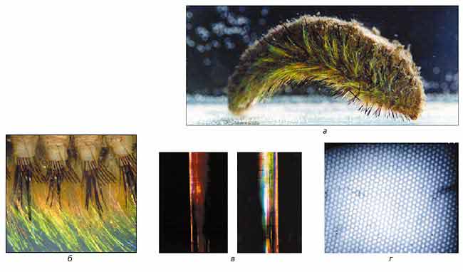Австралийские ученые из университета Сиднея открыли [9], что фотонные кристаллы встречаются в живом мире, а именно в морском черве, живущем в сравнительно глубоких морских водах. Морской червь покрыт “мехом” из иголок с яркой радужной окраской, которая переливается и играет в зависимости от угла падения света и угла наблюдения (рис.12,а,б,в).
