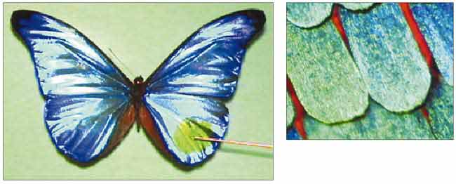 Рис. 13. Бабочка Morpho rhetenor и детали выделенного участка ее крыла.
