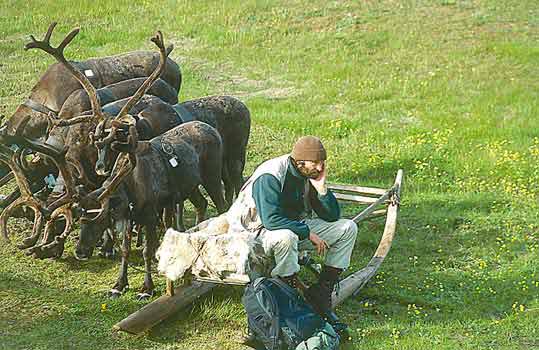 Пастухи держали оленей вольно. Мы отыскивали стадо в 5-10 км от поселка. Это был период отела. Терье подкрадывался к телящимся самкам, ловил и взвешивал новорожденных оленят. Я изучал поведение оленей.