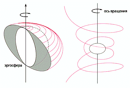 Рис.2. Схематическое изображение вращающейся черной дыры в разрезе. Горизонт событий окружен эргосферой, в которой тела, частицы и фотоны непрерывно двигаются, подхваченные вихревым гравитационным полем черной дыры (слева). Луч света, проходящий вблизи вращающейся черной дыры, завихряет свое движение (справа).Следует отметить, что черные дыры, рождающиеся в нашу эпоху, а не в момент формирования Вселенной, строго говоря, не могут быть стопроцентными черными дырами. Из-за замедления времени вблизи горизонта событий поверхность коллапсирующей звезды с точки зрения далекого наблюдателя бесконечно долго приближается к горизонту событий. Однако уже в первые секунды коллапса поверхность звезды подходит к горизонту очень близко. Поэтому для удаленных наблюдателей современные черные дыры имеют практически ненаблюдаемые поверхности, все процессы на которых очень замедленны. Для астрономов такие дыры являются практически черными дырами, имеющими практический горизонт событий.Тернистый путь к открытию