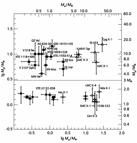 На рис.5 приведена зависимость масс нейтронных звезд и черных дыр от масс их спутников в двойных системах. Массы радиопульсаров в двойных системах определены по релятивистским эффектам в их орбитальном движении. Видно, что корреляции между массами рентгеновских объектов и массами их спутников нет, т.е. тесные двойные системы с нейтронными звездами и черными дырами подобны классическим тесным двойным системам, где встречаются любые комбинации компонентов.
