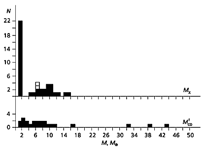 Рис. 6. Гистограмма распределения масс релятивистских объектов Mx в двойных системах (вверху,черные столбцы). Светлые квадратики соответствуют массам одиночных черных дыр, измеренным по эффектам гравитационного микролинзирования. Высокий пик в интервале 1-2 М¤ соответствует нейтронным звездам. Гистограмма распределения конечных масс углеродно-кислородных ядер M fC O для 23 звезд Вольфа-Райе в двойных системах с известными массами (внизу).На рис.6 приведены распределения масс релятивистских объектов и масс предсверхновых - производителей релятивистских объектов - СО-ядер звезд Вольфа-Райе в конце их эволюции. Видно, что распределение масс релятивистских объектов в двойных системах не непрерывно, а имеет провал в интервале масс 2-4 М¤ и является бимодальным. Массы 19 нейтронных звезд лежат в узких пределах 1-2 М¤, среднее значение массы нейтронной звезды равно 1.35±0.15 М¤. Измеренные массы 20 черных дыр лежат в пределах 4-15 М¤ при среднем значении массы черной дыры 7±1 М¤. В интервале масс 2-4 М¤ не обнаружено ни нейтронных звезд, ни черных дыр, хотя ОТО не запрещает существование нейтронных звезд с массами вплоть до 3 М¤. Подчеркнем, что число релятивистских объектов с измеренными массами весьма велико - порядка 40. В то же время распределение масс СО-ядер звезд Вольфа-Райе непрерывно в диапазоне масс 2-15 М¤. Таким образом, по какой-то глубокой причине в природе не рождаются (или аномально редко рождаются) очень массивные (M > 2 M¤) нейтронные звезды и маломассивные (M < 4 M¤) черные дыры. Если эта закономерность подтвердится дальнейшими наблюдательными данными по релятивистским объектам, то она потребует серьезной интерпретации. Недавно было обнаружено, что вспышки сверхновых типа I b/с, сопровождающие коллапсы СО-ядер звезд Вольфа-Райе, распределены по светимостям в максимуме также бимодально: два класса сверхновых типа I b/с (нормальные и яркие сверхновые) различаются по светимости в максимуме на порядок величины.В последние годы все более утверждается точка зрения о том, что коллапсы СО-ядер быстро вращающихся звезд, связанные с образованием предельно быстро вращающихся керровских черных дыр в различных галактиках, могут быть источниками знаменитых и пока загадочных гамма-всплесков, при которых за время в несколько секунд выделяется гигантская энергия в гамма-диапазоне ~1046 Дж [7].