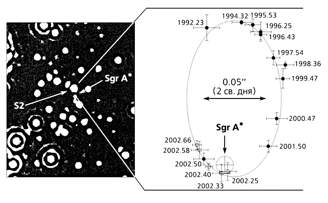 Рис. 9. Ближайшие окрестности радиоисточника Sgr A* (сверхмассивная черная дыра массой 4·106 M¤) в созвездии Стрельца в направлении центра нашей Галактики (слева). Вокруг центра Галактики обращается звезда S2 с периодом 15.2 года. Справа показаны наблюдения 1992-2002 гг., демонстрирующие движение звезды S2 по эллиптической орбите вокруг сверхмассивной черной дыры в центре Галактики.Радиоинтерферометрические наблюдения со сверхдлинной базой на волне 3.5 мм (рис.10), выполненные китайскими учеными в 2005 г. [8], показали, что радиус излучающей области вокруг черной дыры в центре Галактики составляет 1 а.е., то есть всего около 13 гравитационных радиусов (rg = 17 R¤ для M = 4·106 M¤). Размер этого компактного радиоисточника увеличивается с длиной волны вследствие рассеяния радиоизлучения. Поэтому дальнейшие наблюдения на более коротких волнах, вероятно, позволят увидеть ближайшие окрестности горизонта событий черной дыры в центре Галактики. Это даст возможность непосредственно наблюдать эффекты сильного гравитационного искривления электромагнитных лучей в поле тяжести черной дыры, приводящие к появлению «тени» в распределении радиояркости вблизи горизонта событий, что прямо доказало бы: компактный объект в центре нашей Галактики - черная дыра в смысле ОТО.