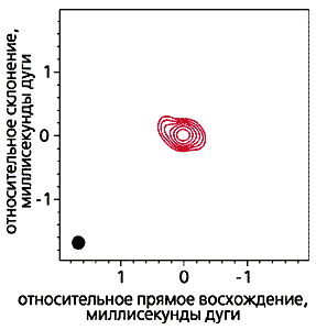 Рис. 10. Радиоизображение области центра нашей Галактики с угловым разрешением 2·10-4’’, полученное на волне 3.5 мм методом радиоинтерферометрии со сверхдлинной базой [8]. Темное пятно в левом нижнем углу характеризует размер диаграммы направленности радиоинтерферометра. Видно, что центральная черная дыра массой 4·106 М¤ окружена оболочкой из плазмы, излучающей в радиодиапазоне, радиус которой составляет 1 а.е. Оценки плотности вещества в измеренной области вокруг центральной черной дыры дают величину 6.5·1021 М¤/пк3 - на 16 порядков выше плотности звезд в наиболее плотных звездных скоплениях. Если бы компактный объект в центре Галактики был не черной дырой, а скоплением отдельных темных тел (старых белых карликов, нейтронных звезд, черных дыр звездной массы), то при столь чудовищной плотности это скопление из-за коллективных взаимодействий рассеялось бы менее чем за 100 лет. Поэтому массивный (М = 4·106 М¤) и компактный (r < 12.6 rg) объект в центре Галактики должен быть единым телом, скорее всего, черной дырой.