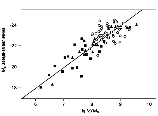 Рис. 11. Абсолютная звездная величина балджа МR галактики, пропорциональная логарифму его массы, как функция логарифма массы сверхмассивной черной дыры М в ее центре. Обозначения: Ѓ - нормальные галактики, n - сейфертовские галактики I типа, Ў - квазары.Со светимостью галактического диска, которая обусловлена в основном молодыми звездами, родившимися менее миллиарда лет назад, масса центральной черной дыры не коррелирует. Для ядер активных галактик найдена зависимость между массой центральной черной дыры и светимостью ядра галактики в оптическом диапазоне. В то же время для ядер «спокойных» галактик (которые составляют 99% от общего числа галактик) подобная корреляция не наблюдается.Выявлена корреляция между максимальной скоростью вращения галактики (характеризующей ее полную массу) и массой центральной черной дыры. Отсюда следует, что масса черной дыры возрастает с массой гало галактики, состоящего из темной материи [9]. Значит ли это, что за формирование центральной черной дыры ответственна загадочная темная материя?