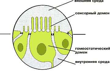 По расположению в ткани рецепторная клетка напоминает айсберг и, подобно ему, имеет надводную часть и подводную. Если говорить языком физиологов, то сенсорный домен, обращенный во внешнюю среду, — надводная часть «айсберга», а гомеостатический домен — подводная часть. Он соседствует с другими сенсорными или вспомогательными клетками и обеспечивает гомеостаз и жизнедеятельность своей хозяйки, а также передачу сигнала в нервную систему. Сенсорная клетка, как и любая другая, ограничена плазматической мембраной, и естественно, что любое возмущение во внешней среде воздействует прежде всего на мембрану надводной части «айсберга». В ходе эволюции именно плазматическая мембрана сенсорного домена рецепторной клетки и превратилась в молекулярный биосенсор той или иной системы модальности. Таким образом, можно сказать, что сенсорная клетка морфологически поляризована.