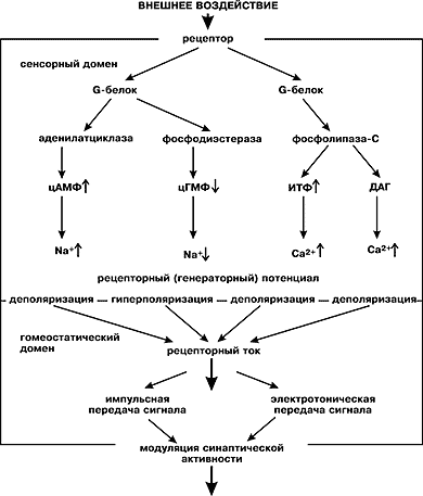 Рецептивный белок при взаимодействии с сигнальной молекулой или квантом света изменяет свою конформацию, «активируется» и становится доступным для взаимодействия с G-белком (от англ. gain — усиление). За время своей активации рецептивный белок переводит в активное состояние несколько десятков молекул G-белка, а каждая из них в свою очередь успевает «возбудить» несколько десятков молекул специального фермента. Этот фермент либо продуцирует, либо разрушает молекулы внутриклеточного медиатора (его называют также мессенджером, внутриклеточным посредником), который непосредственно регулирует состояние ионных каналов. Таким образом, единичное микрособытие на входе сенсорного рецептора приводит к массовому изменению состояния ионных каналов. Это изменение на выходе регистрируется нервной системой в виде тоже единичного, но уже макрособытия — рецепторного сигнала.