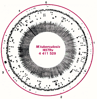 В конце 1998 г. усилиями огромного коллектива молекулярных биологов из Великобритании, США, Франции и Дании полностью расшифрован геном Mycobacterium tuberculosis H37Rv — наиболее изученного лабораторного штамма (Cole S.T., Brosch R., Parkhill J. et al. // Nature. 1998. V.393. №6685. P.537—544). Этот самый медленно растущий на искусственных средах микроорганизм имеет довольно большой геном (4 411 529 пар нуклеотидов), 65.6% которого составляют гуанин и цитозин, что соответствующим образом отражается на аминокислотном составе бактериальных белков, которые в свою очередь определяют специфические особенности заболевания. Из 4000 генов 60 кодируют функциональные компоненты РНК: уникальный рибосомальный РНК оперон, 10Sа РНК, участвующий в деградации белков с нетипичной матричной РНК, РНК компонент фермента РНК-азы Р, а также 45 транспортных РНК (тРНК).