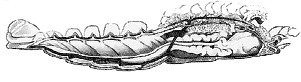 направление кровотока показано стрелкой рядом с сердцем.Жоффруа Сент-Илер отмечал обратное, по сравнению с беспозвоночными, расположение нервной системы и сердца у хордовых. Но расположение нервной системы - критерий недостаточно убедительный: у беспозвоночных может быть несколько продольных нервных стволов, причем не только на брюшной стороне, но также по бокам и вдоль спины. Например, у представителей класса кишечнодышащих из типа полухордовых (ближайших родственников хордовых) два продольных нервных ствола: брюшной и спинной, причем спинной ствол у них частично свернут в трубку, точно так же, как у хордовых. Следовательно, можно предположить, что у предка хордовых было два нервных ствола, как у современных полухордовых, но затем брюшной ствол редуцировался и остался только спинной. И в этом случае гипотеза “перевернутости” не нужна.