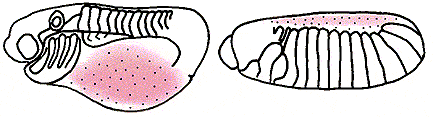 Расположение желтка (показано цветом) у зародышей лягушки (вверху) и дрозофилы.