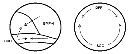 Формирование структур и органов спинной и брюшной сторон тела у позвоночных и насекомых определяется соотношением концентраций упомянутых белков. Так, у зародыша лягушки в норме белок CHD синтезируется на спинной стороне, но если в опыте повысить его концентрацию на брюшной с помощью инъекции, необходимой для его синтеза матричной РНК, то на этом месте в дальнейшем разовьются структуры спинной стороны. Наоборот, искусственное повышение концентрации белка BMP-4 на спинной стороне зародыша вызывает развитие там структур брюшной стороны. Аналогичные результаты были получены и на дрозофиле: формирование структур спинной стороны связано с повышенной концентрацией белка DPP, а брюшной - SOG.