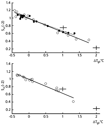 Зависимость площади вечной мерзлоты, ограниченной индексом суровости –2 и нормированной на современное значение, в Северном полушарии для различных десятилетий от изменения среднегодовой глобальной приповерхностной температуры для модели общей циркуляции (вверху) и климатической модели промежуточной сложности ИФА РАН (внизу). Сплошные кружки - эксперимент с учетом аэрозолей, пустые - без них. Сплошной и пунктирной линиями обозначены соответствующие линейные регрессии. Для сравнения на рисунках нанесены крестики, соответствующие данным палеореконструкций для оптимума голоцена (серые) и Микулинского межледниковья для Северной Евразии (черные).