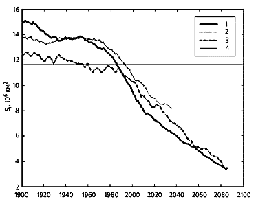 Изменение площади вечной мерзлоты, ограниченной индексом суровости –2, в Северном полушарии при десятилетнем скользящем усреднении в численных экспериментах: 1 - по модели общей циркуляции без учета аэрозоля, 2 - с учетом аэрозоля, 3 - по модели промежуточной сложности ИФА РАН без учета аэрозоля; 4 - современное значение площади, покрытой сплошной вечной мерзлотой.Отметим в заключение, что мы не рассматривали ни мелкомасштабные характеристики ландшафта и растительности, ни свойства грунта, важные для эволюции многолетней мерзлоты, ни вертикальные особенности геокриологических процессов, в том числе в снежном покрове и в слое сезонного протаивания. А именно они определяют инерционное запаздывание реакции мерзлоты на изменение поверхностных условий. Многие мерзлотоведы связывают современное повышение температур мерзлых грунтов с увеличением толщины снежного покрова. Некоторые черты этих процессов позволяют воспроизвести современные одномерные геокриологические модели, которые непрерывно совершенствуются, и уже в обозримом будущем их можно будет включать в модели будущих изменений климата в качестве отдельных блоков, приспособленных для описания процессов в холодных грунтах.